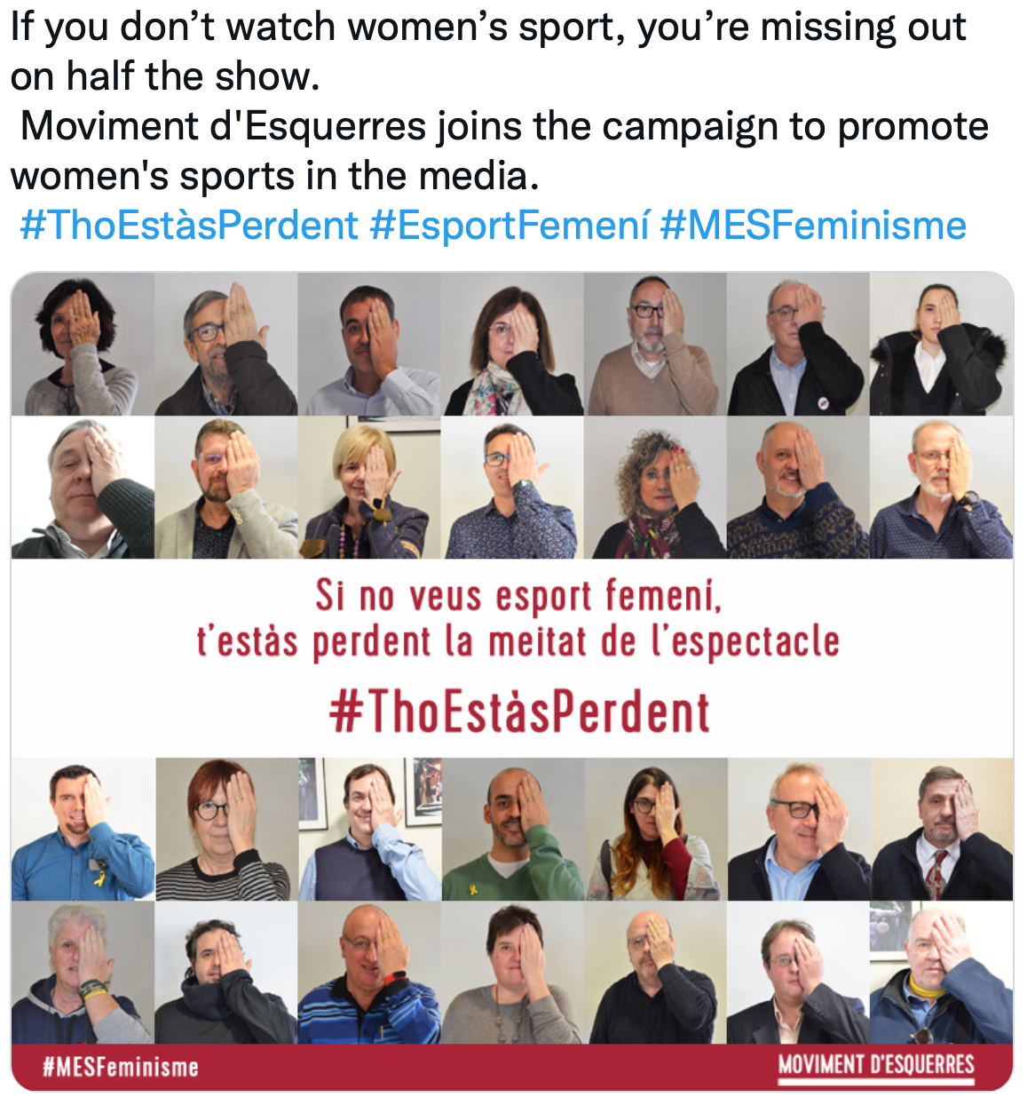 A huge campaign in Catalonia, Spain where they got tons of Catalonians to give the one-eye sign in support of women’s sports. All in the name of the worldwide gender equality/equity agenda.