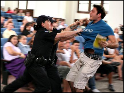 Undergrad student, Andrew Meyer had been allowed to ask Senator Kerry a question during their question period. Meyer asked Senator Kerry about his membership to the secret society Skull & Bones. Campus police immediately restrained, tazed, and arrested Meyer as the audience applauded.
