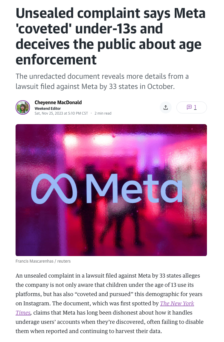 https://www.engadget.com/unsealed-complaint-says-meta-coveted-under-13s-and-deceives-the-public-about-age-enforcement-231034682.html?utm_source=tldrmarketing&guccounter=1