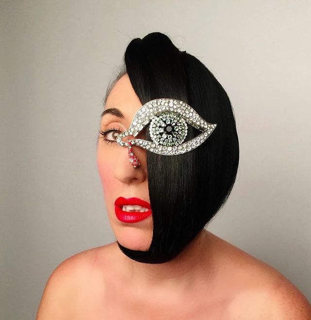 Google that lady and look at her photos. She is naturally a walking one eye symbol, her eyes are very different from each other. It’s like a Picasso painting.