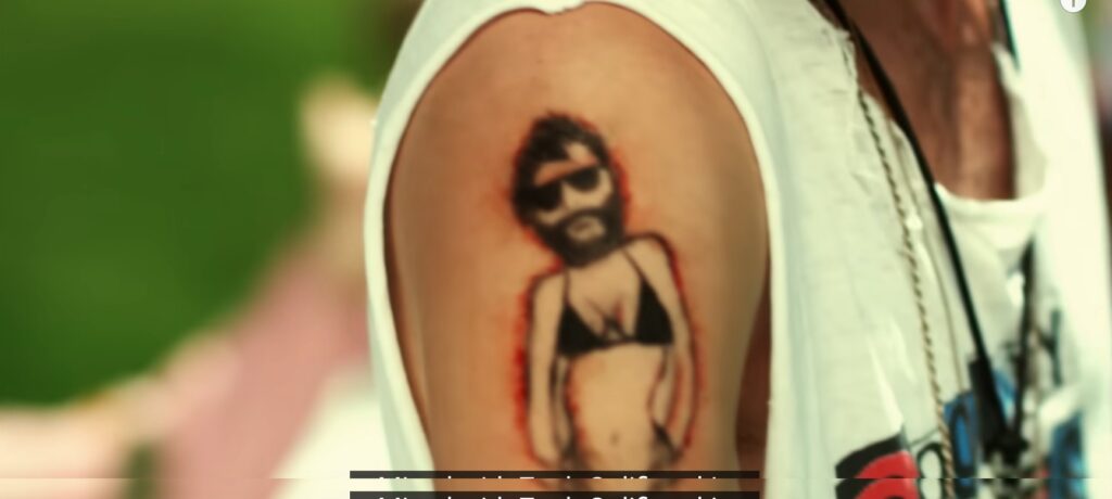 In the music video a man gets a tattoo of a man with breasts (0:54)