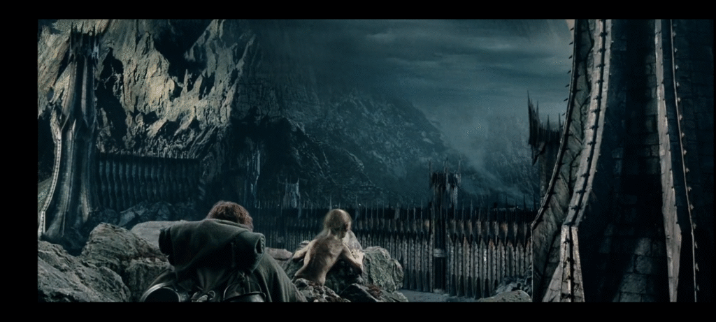 This is the scene where they finally reach “the black gate of Mordor” where the witch kings and their orcs live.